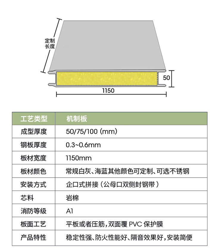厚度企口型厚度:40~150mm;瓦楞型厚度:50~150mm。