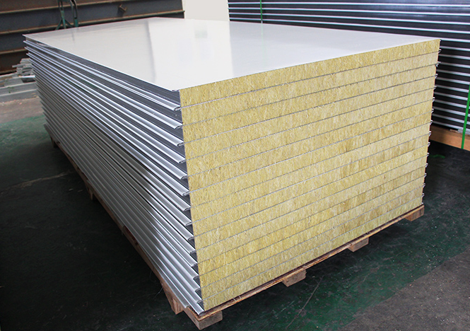 1)上下表面:采用鍍鋅彩色鋼板,厚度為0.4-0.8mm。根據客戶的具體要求,也可采用鍍鋁鋅彩色鋼板或鍍鋅鋼板。鋼板先經成型機軋制成型后在與巖棉工廠復合。