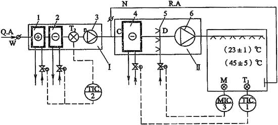 Ⅰ-新風處理機組,Ⅱ-主空氣處理機組;1-新風預加熱器;