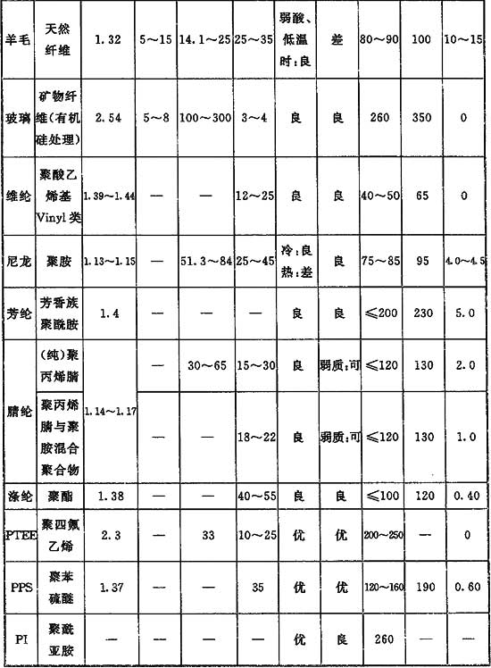 濾料性能應滿足生產條件和除塵工藝的要求,濾料的主要性能包括耐溫性能、耐酸堿性能等,選擇濾料應對各種因素進行對比,抓住主要影響因素選擇濾料。應盡可能選擇使用壽命長的濾料。表面過濾方式已被公認為有助于提高除塵效率,濾料表面覆膜可實現濾袋表面過濾,常用的覆膜材料如聚四氟乙烯(PTFE)。選用覆膜濾料會增加造價,因此宜在技術經濟條件合理時選用。常用濾料的物性指標總結在表4中。