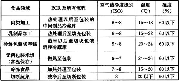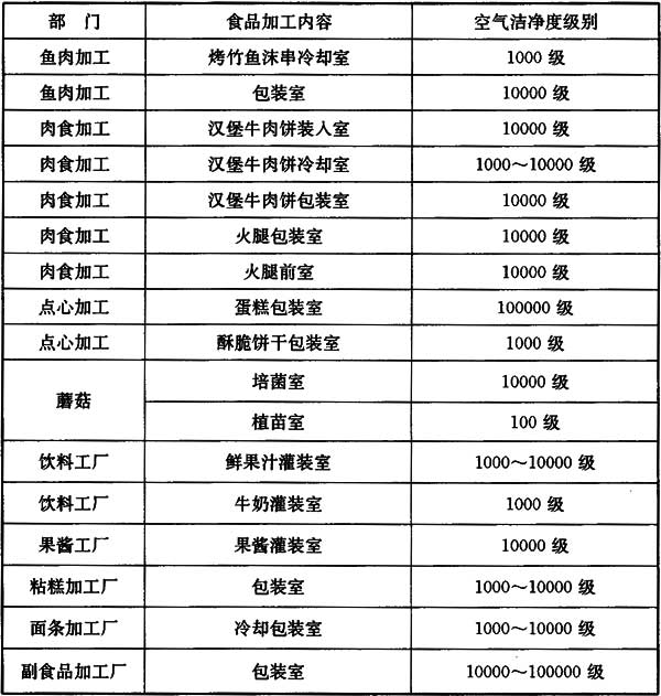 表10 食品工業(yè)中各部門對潔凈度的要求