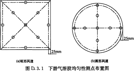 2 可在過濾器下游(或混勻裝置下游)適當距離處,選擇一斷面,在該斷面上至少布置9個采樣管,采樣管為開口迎向氣流流動方向的剛性金屬管,管徑應盡量符合常規(guī)采樣儀器的等動力采樣要求,其中5個采樣管在中心和對角線上均勻布置,4個采樣管分別布置于矩形風道各邊中心、距風道壁面25mm處(圖D.3.1a)。圓形風道采樣管布置采用類似原則進行(圖D.3.1b)。應在氣溶膠發(fā)生器穩(wěn)定工作后(此時被測過濾器上游氣溶膠濃度至少應為進行效率測試試驗時下限濃度的2倍以上),對每個測點依次進行至少連續(xù)3次采樣,每次采樣時間不應少于1min,并取其平均值作為該點的氣溶膠濃度檢測結(jié)果。當所有9個測點的氣溶膠濃度測試結(jié)果與各測點測試結(jié)果算術(shù)平均值偏差均小于±20%時,可認為過濾器下游氣溶膠濃度均勻性滿足測試需要。